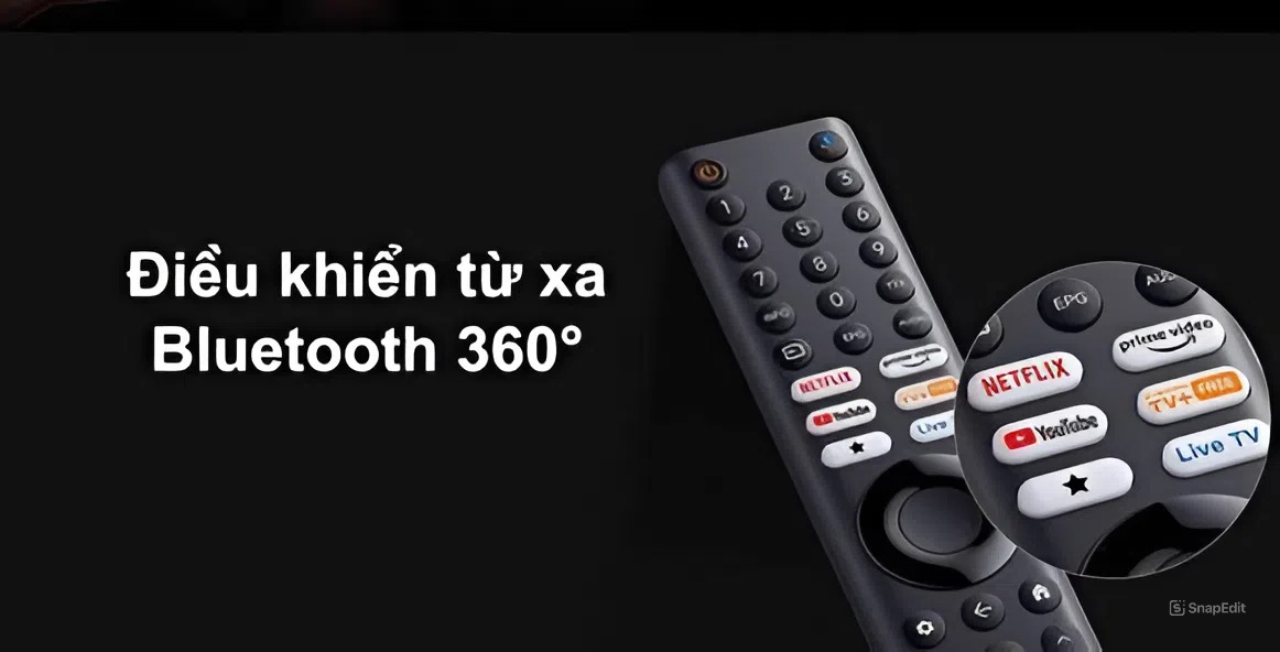 Remote điều khiển đi kèm hỗ trợ Bluetooth 5.0 với khả năng nhận tín hiệu 360 độ, cho phép bạn điều khiển TV từ mọi góc độ trong căn phòng mà không cần hướng thẳng về thiết bị. Đặc biệt, tính năng điều khiển giọng nói thông minh giúp bạn dễ dàng tìm kiếm nội dung yêu thích, chuyển kênh hoặc bật tắt ứng dụng chỉ bằng một câu nói. Ngoài ra, các phím chức năng có thể tùy biến theo nhu cầu sử dụng, mang lại sự tiện nghi tối đa cho người dùng.