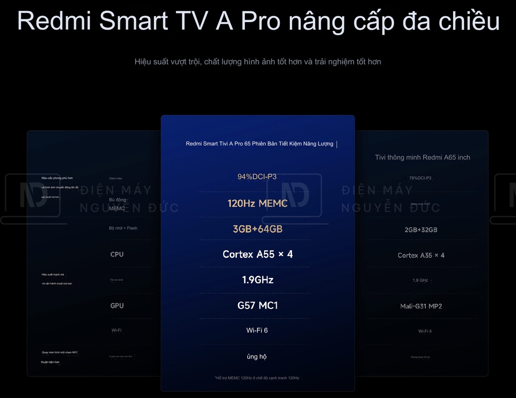 Không chỉ mạnh mẽ về mặt hình ảnh, Tivi Xiaomi A Pro 65 Inch còn sở hữu cấu hình vượt trội với dung lượng RAM 3GB và bộ nhớ trong 64GB. Nhờ vào đó, tivi có thể xử lý nhanh chóng và mượt mà các tác vụ, từ việc chuyển kênh đến sử dụng các ứng dụng phổ biến như Netflix, YouTube, hay Prime Video mà không gặp phải tình trạng giật lag.