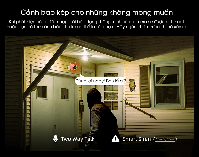 Khi có kẻ lạ mặt đột nhập vào ngôi nhà, âm thanh còi báo động thông minh của camera Imilab EC3 Pro sẽ được kích hoạt để cảnh cáo kẻ trộm cũng như thông báo cho người dùng thông qua tính năng đàm thoại 2 chiều.