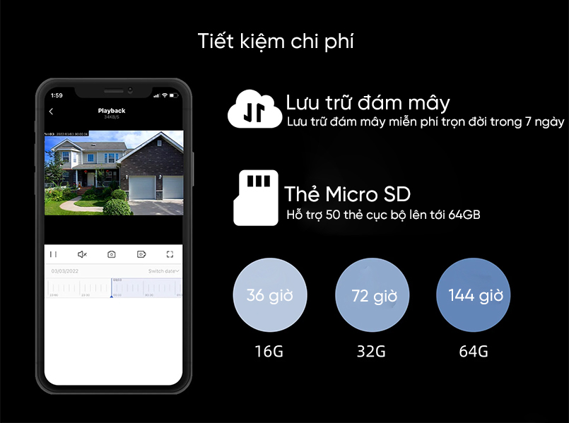 Imilab EC3 Pro có khả năng lưu trữ đám mây với thời gian luân phiên 7 ngày miễn phí cùng thẻ micro SD với dung lượng lưu trữ tối đa 64GB.