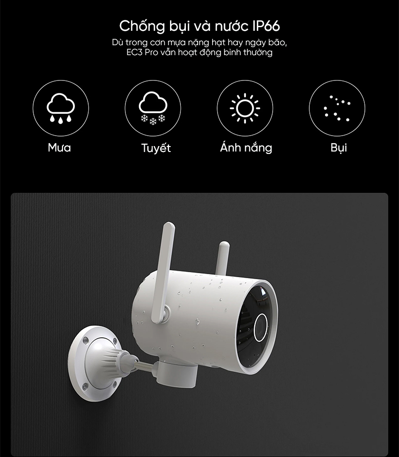 Imilab Security Camera EC3 Pro có khả năng chống chịu tốt mọi tác động từ thời tiết bên ngoài dù là mưa, tuyết, năng hay là bụi bẩn.