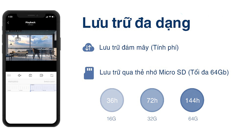Hỗ trợ lưu trữ: Thẻ Micro SD (lên đến 256GB), MI dịch vụ đám mây (7 ngày cán sự kiện vedio miễn phí)