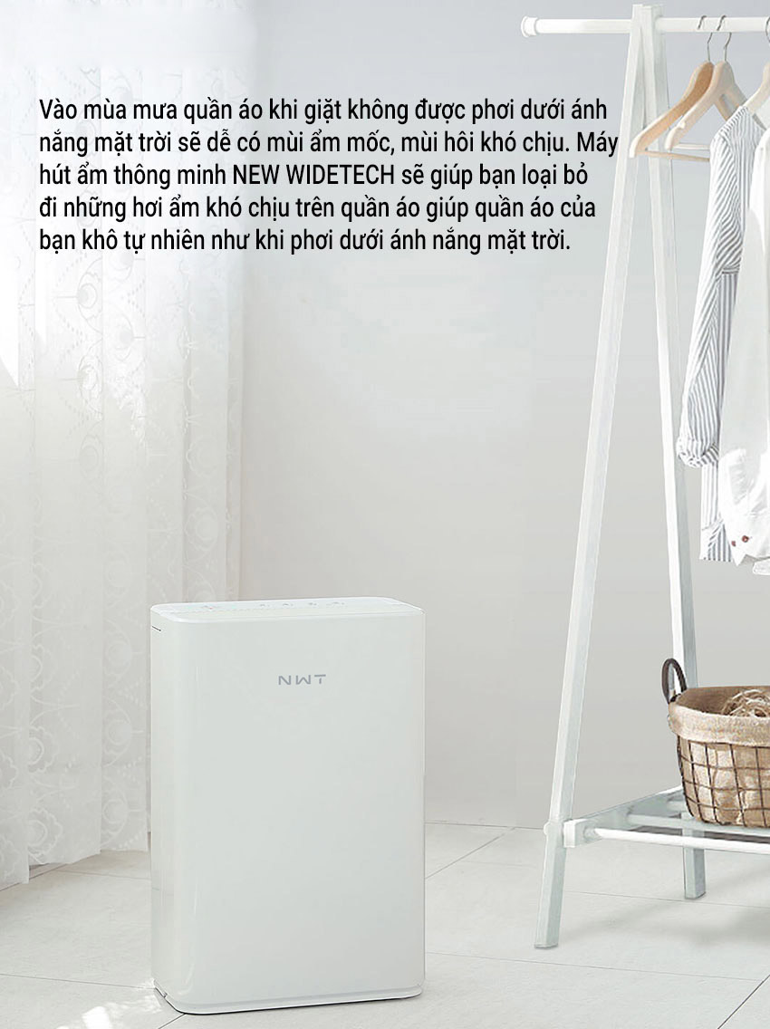 Vào mùa mưa khi quần áo không được phơi dưới ánh nắng mặt trời sẽ dễ gây mùi ẩm mốc, mùi hôi khó chịu thì tính năng đặc biệt khác không thể không kể đến của NEW WIDETECH đó chính là khả năng sấy khô quần áo nhanh chóng, loại bỏ hơi ẩm trên quần áo hiệu quả không khác gì phơi khô bằng ánh nắng mặt trời. Quá trình sấy khô này giúp quần áo dễ dàng loại bỏ mùi ẩm mốc khó chịu do quần áo không thể phơi khô khi trời mưa triền miên.