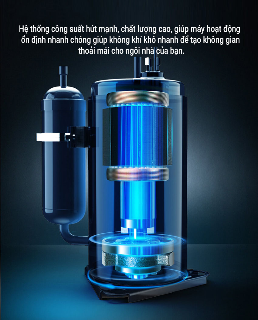 Máy hút ẩm được sử dụng một máy nén công suất hút hoạt động mạnh mẽ chất lượng cao và ổn định, đảm bảo an toàn tuyệt đối trong quá trình hút ẩm.
