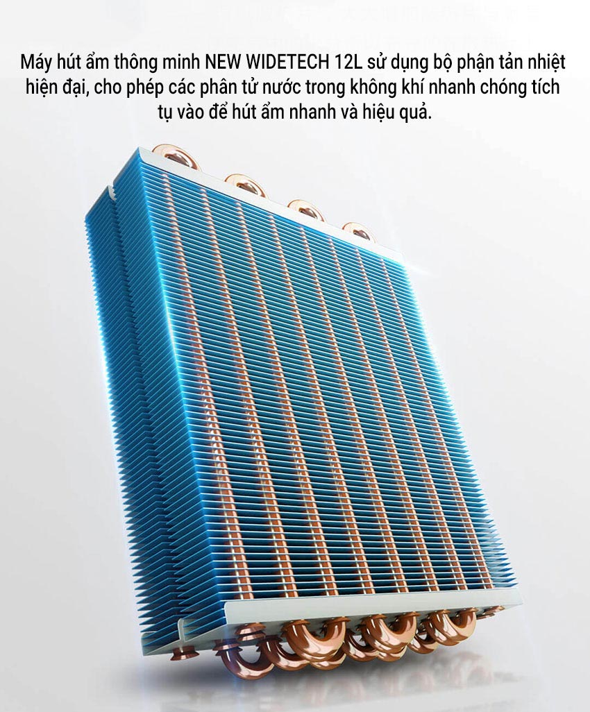 Máy hút ẩm không khí thông minh NEW WIDETECH sử dụng bộ phận tản nhiệt hiện đại, giúp tăng khả năng tản nhiệt cho thiết bị.