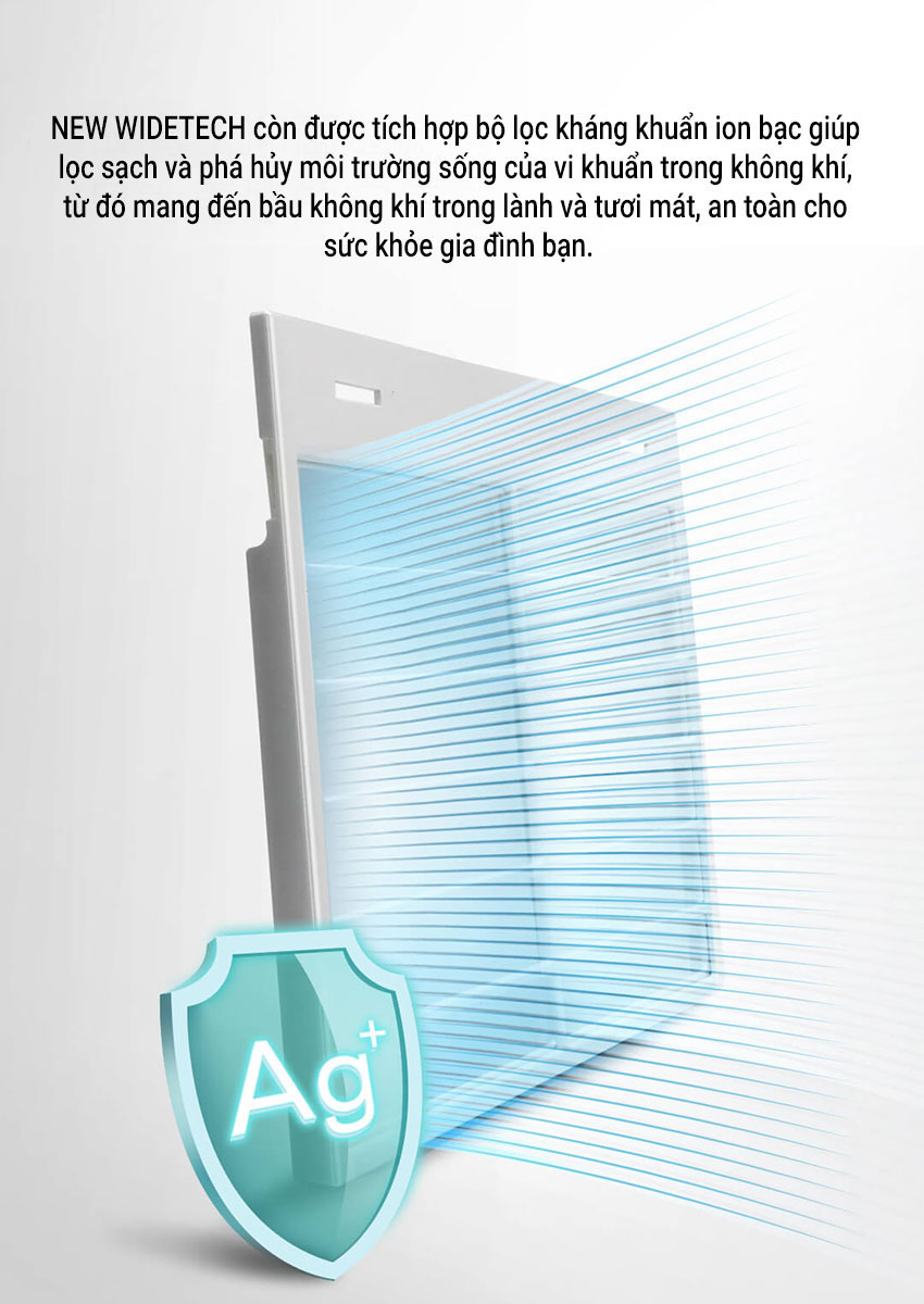 NEW WIDETECH còn được tích hợp bộ lọc kháng khuẩn ion bạc giúp mang đến bầu không khí trong lành và an toàn cho sức khỏe của bạn và gia đình.