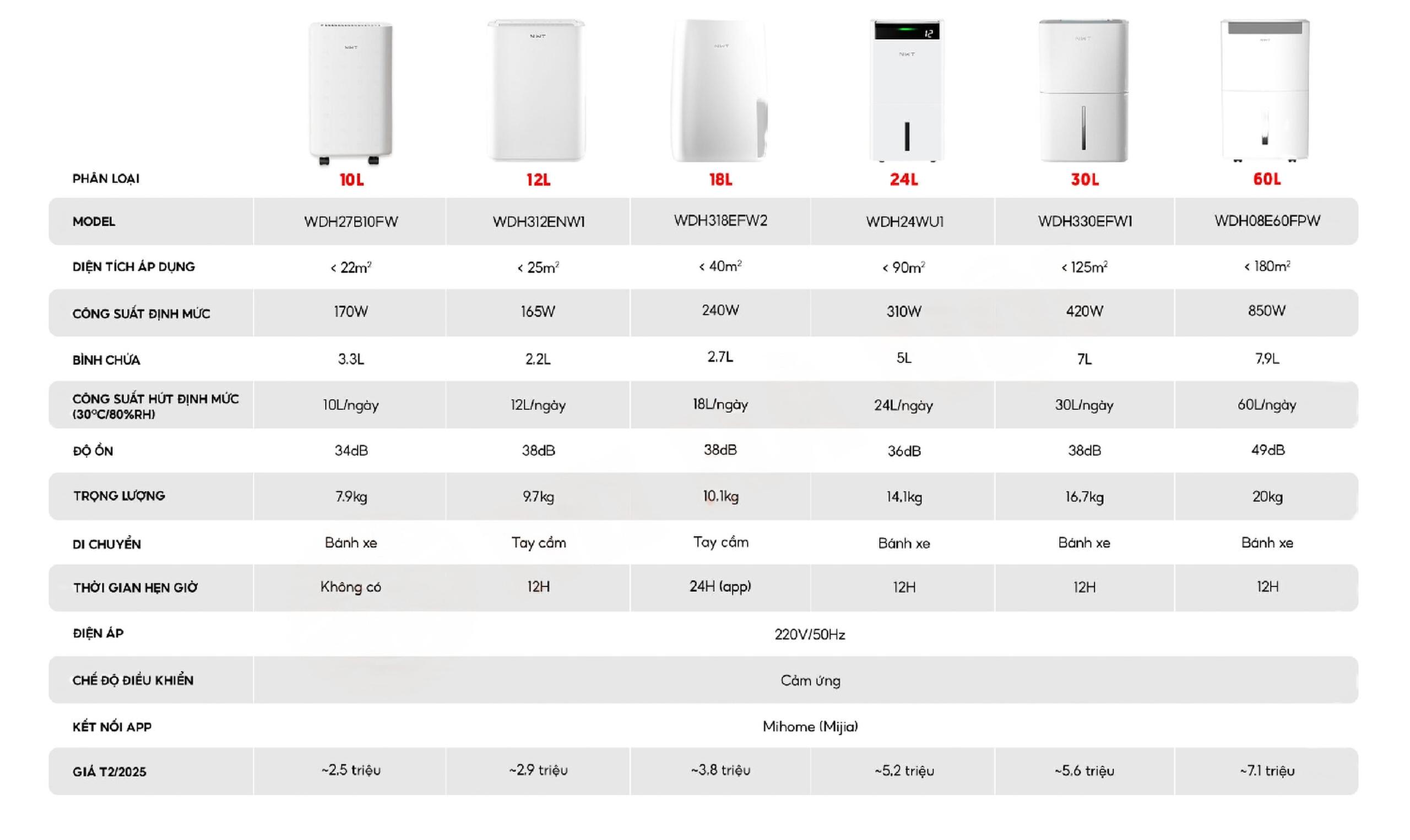 Với công suất hút ẩm hàng ngày là 12L, 18L hoặc 30L bạn có thể dễ dàng sử dụng cho các phòng khác nhau như nhà tắm, bếp, phòng ngủ, phòng khách… để tạo một bầu không gian thoải mái cho ngôi nhà của bạn.