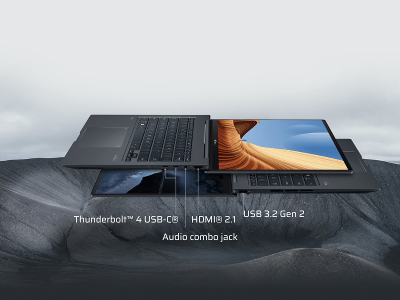 Laptop Asus Zenbook 14X OLED Q410VA được tích hợp gần như là đầy đủ mọi loại cổng kết nối hiện đại thông dụng hiện nay bao gồm: một cổng USB-A 3.2 Gen2, 2 cổng Thunderbolt™ 4 hỗ trợ xuất hình và sạc, cổng HDMI 2.0b, khe thẻ microSD và jack tai nghe 3.5mm combo.