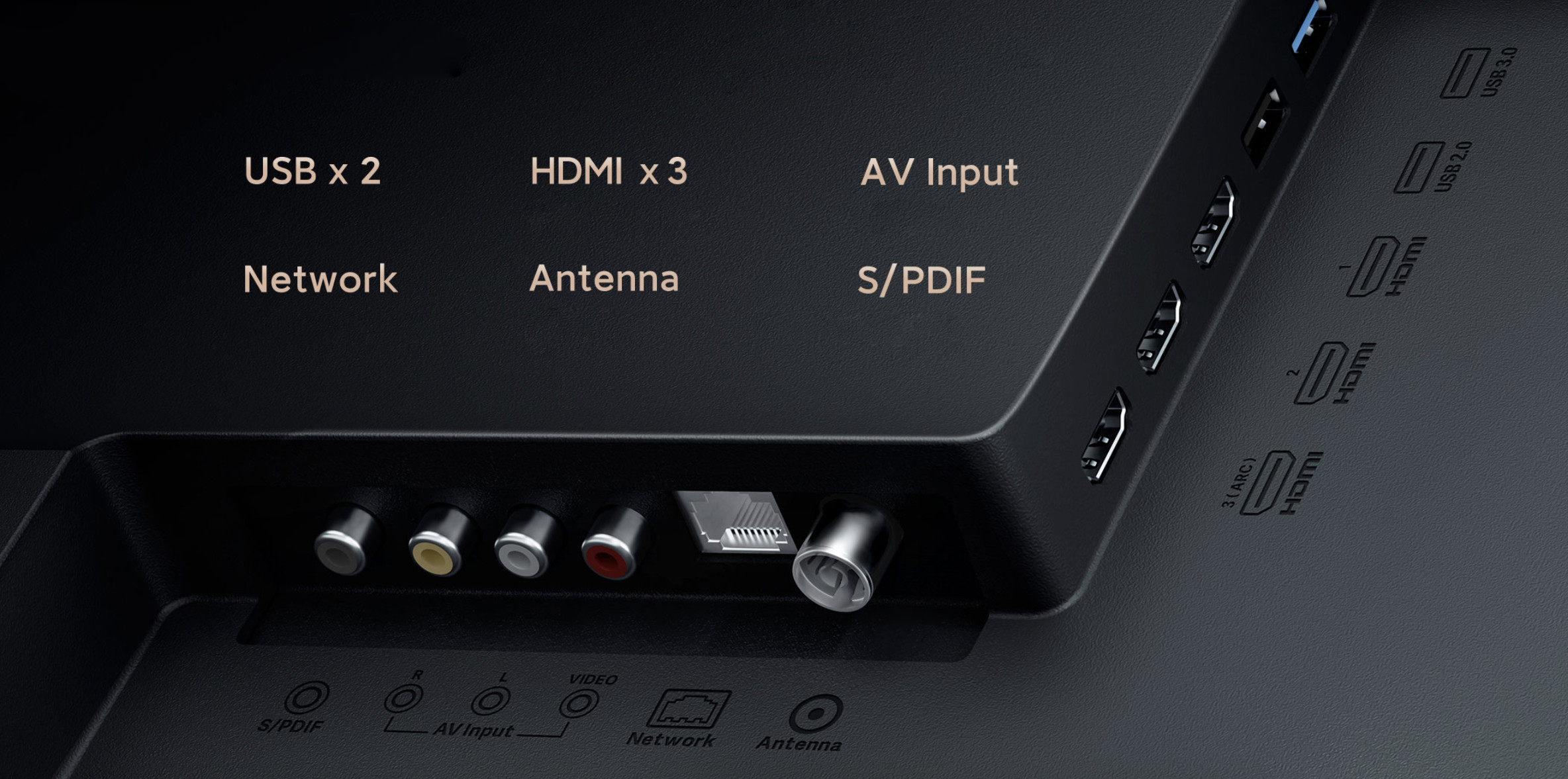 Tivi Xiaomi ES75 Series 4K được trang bị 3 cổng HDMI, 2 Cổng USB, Network, AV Input, Antenna, S/PDIF dễ dàng kế nối với máy tính, bảng điều khiển trò chơi và thiết bị âm thanh bên ngoài.