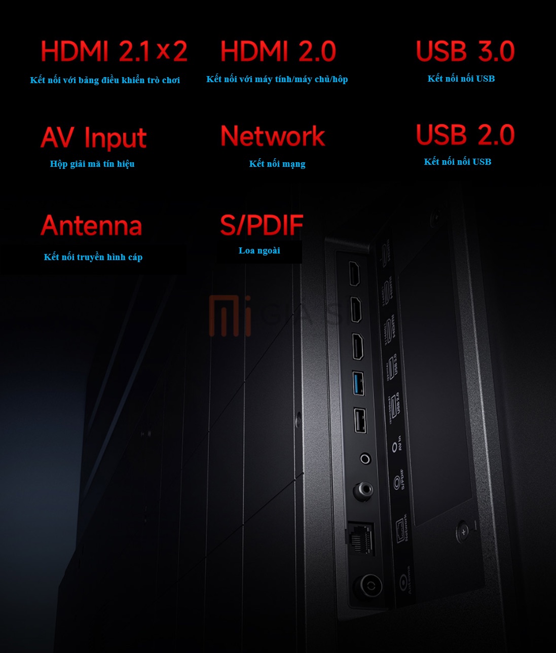 Về cổng kết nối, TV Xiaomi Redmi Max 90 inch được trang bị một số cổng như HDMI 2.1 x 2, HDMI 2.0, USB 3.0, USB 2.0, cổng cắm dây mạng, đầu vào AV và các cổng giao tiếp khác. Điều này cho phép người dùng kết nối tới nhiều thiết bị khác nhau và trải nghiệm nội dung đa dạng trên màn hình siêu lớn của TV này.