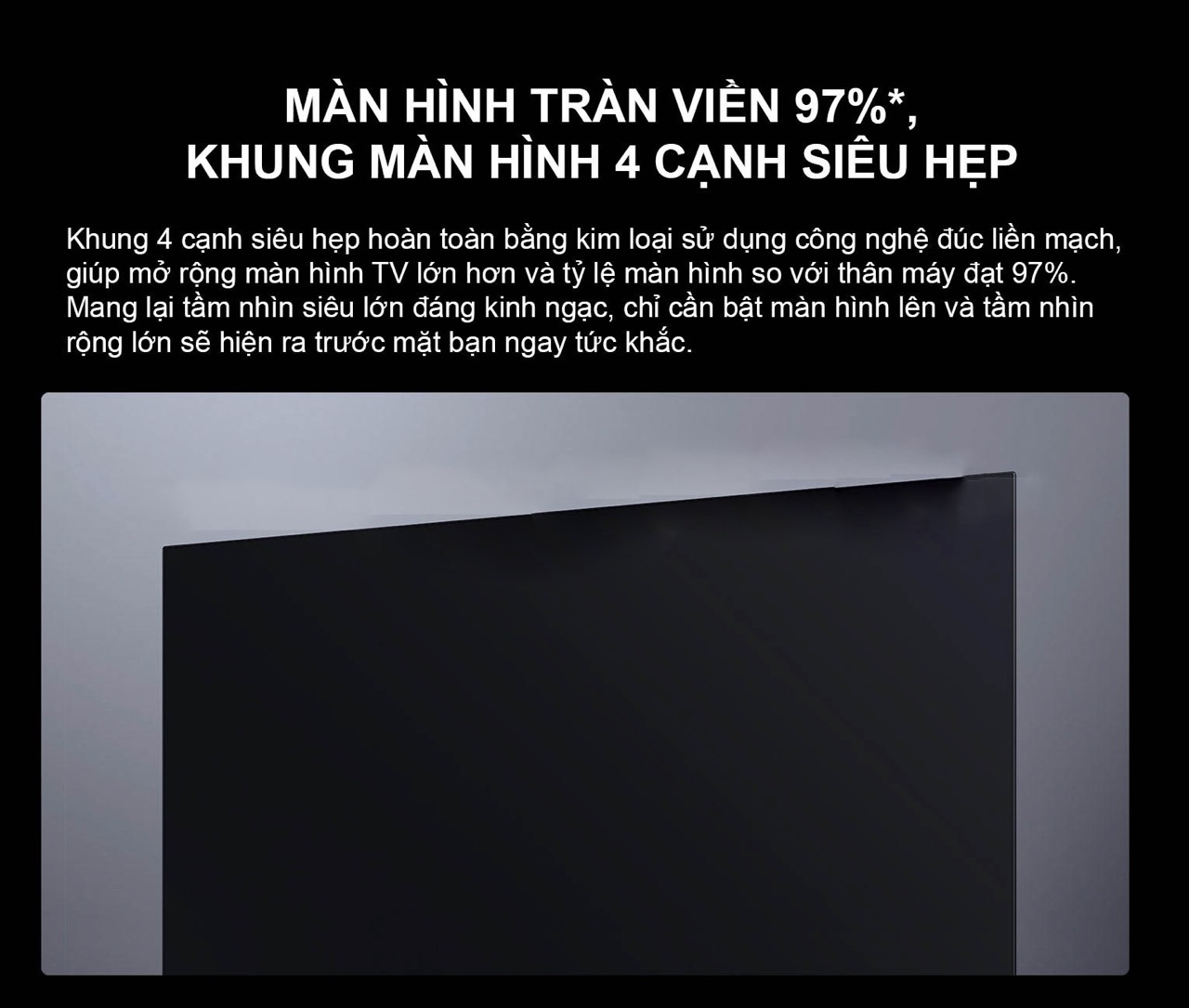 Khung 4 cạnh siêu hẹp giúp mở rộng màn hình TV, tỷ lệ màn hình so với thân máy đạt 97%. Một tầm nhìn siêu lớn đáng kinh ngạc sẽ hiện ra trước mắt bạn ngay khi bật màn hình.