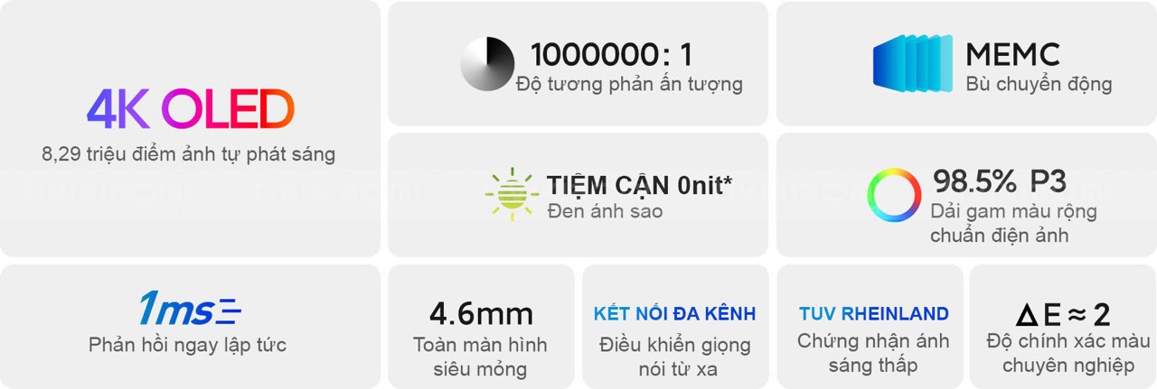 Sở hữu 8,29 triệu điểm ảnh tự phát sáng cùng dải gam màu chuẩn điện ảnh. Tivi Xiaomi TV6 65 inch OLED 4K có độ tương phản ấn tượng cùng độ chính xác màu chuyên nghiệp. Dễ dàng kết nối đa kênh bằng điều khiển giọng nói từ xa.