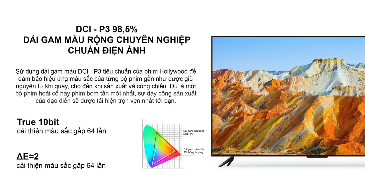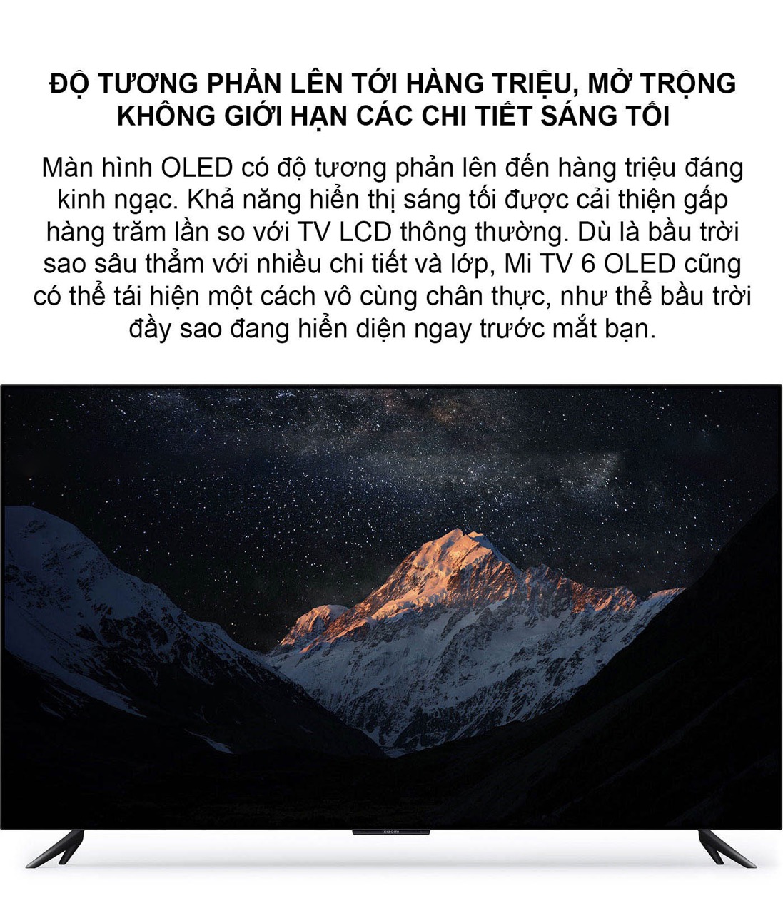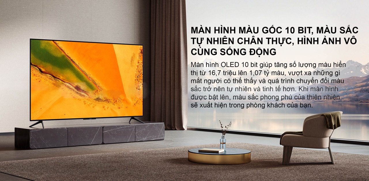 Tivi Xiaomi TV6 65 inch OLED 4K có màn hình OLED 10 bit giúp tăng số lượng màu hiển thị từ 16,7 triệu lên 1,07 tỷ màu., khiến quá trình chuyển đổi màu sắc trở nên tự nhiên và tinh tế hơn