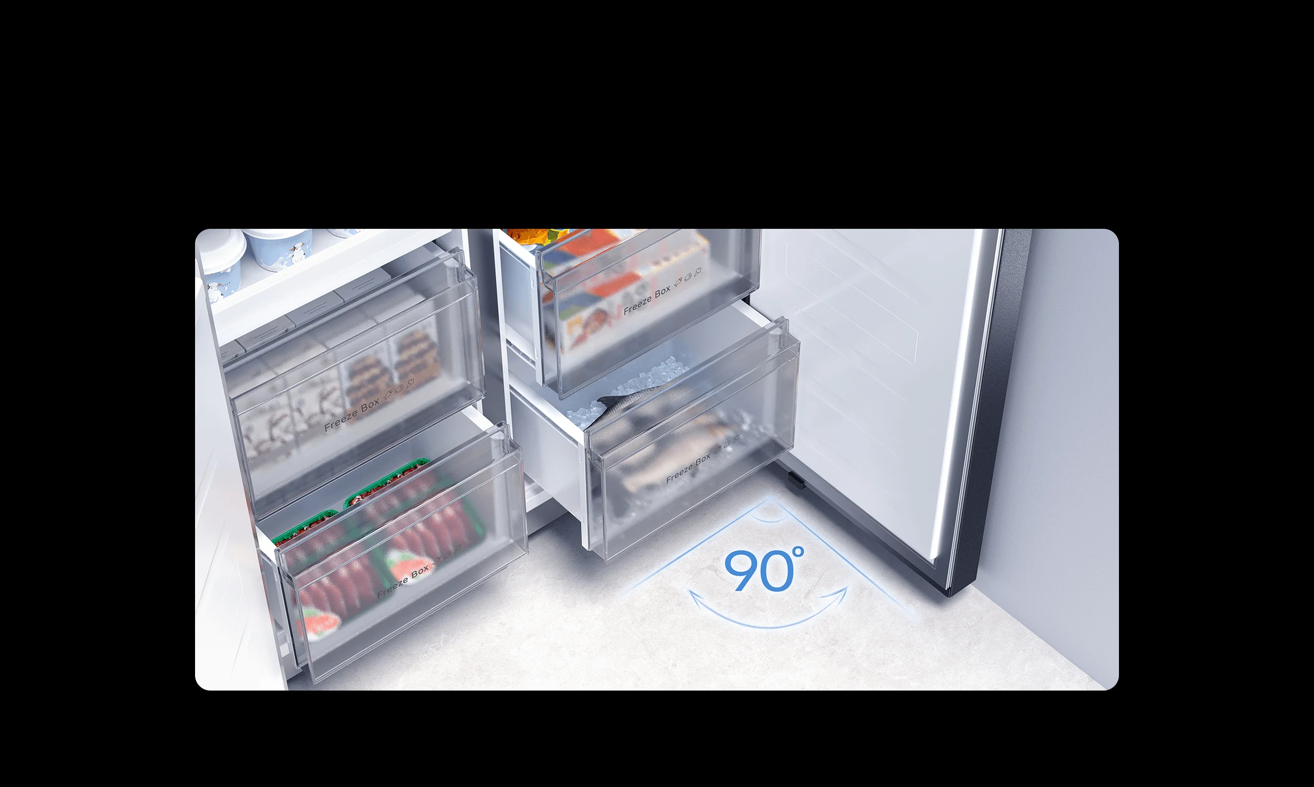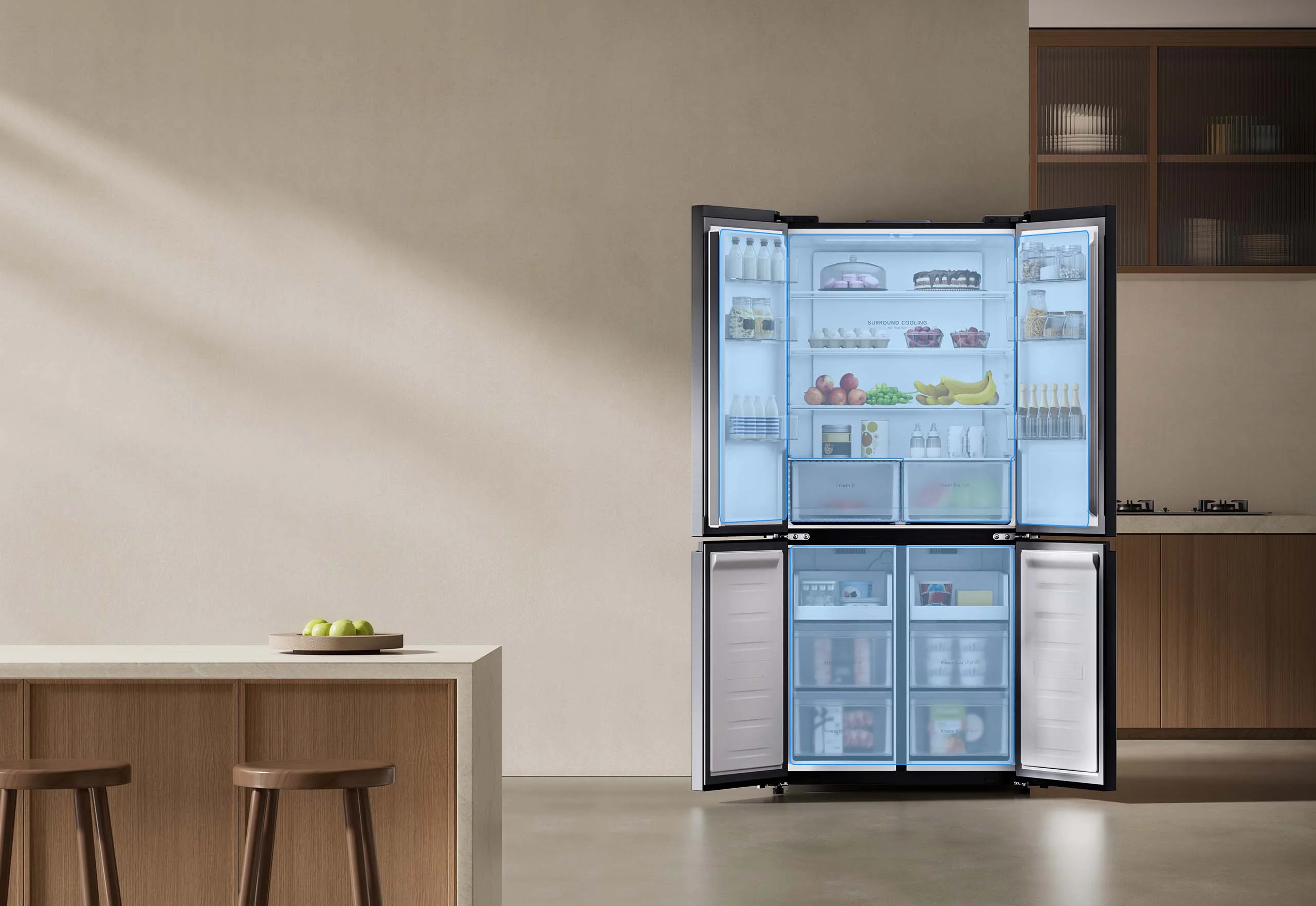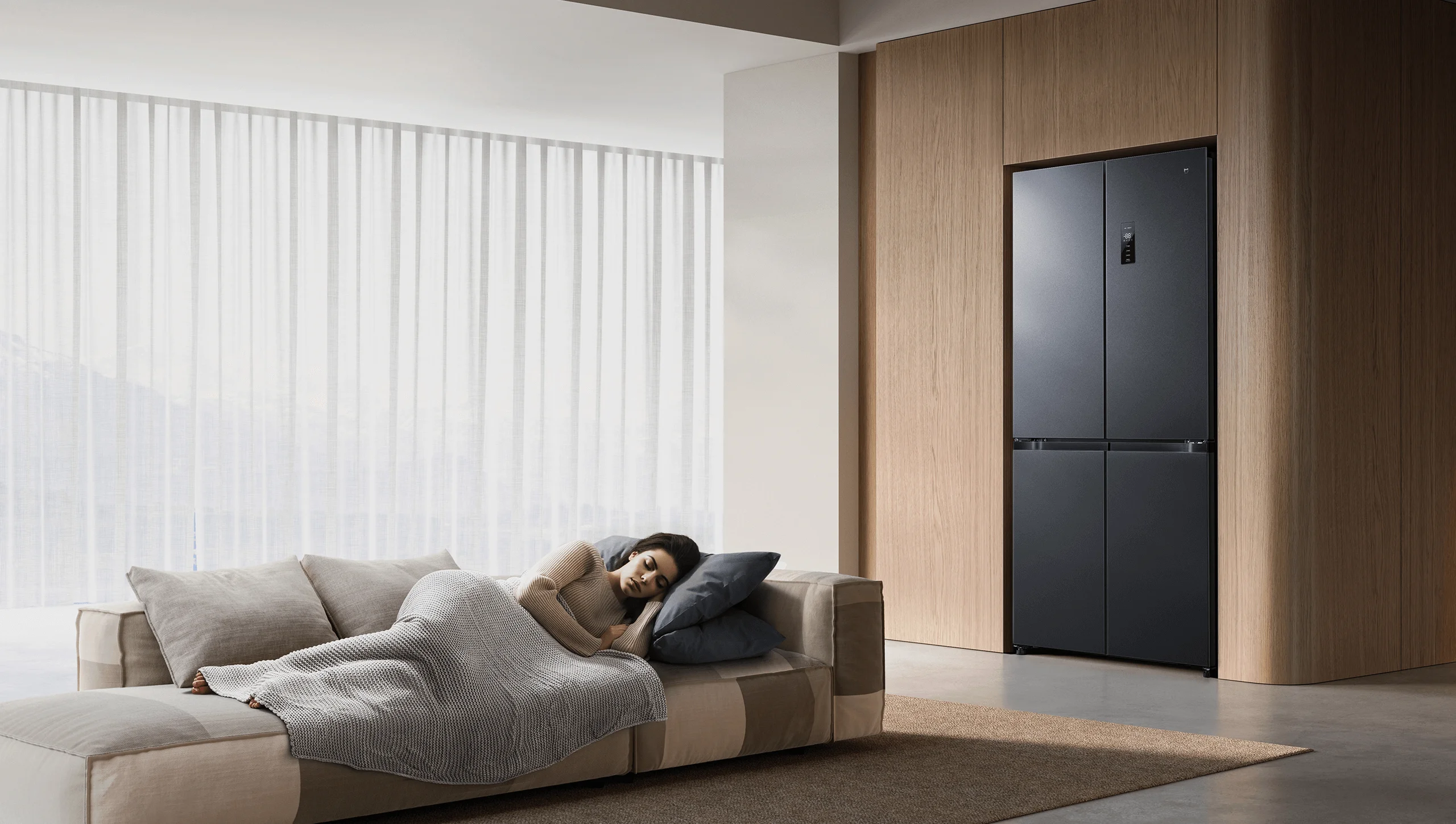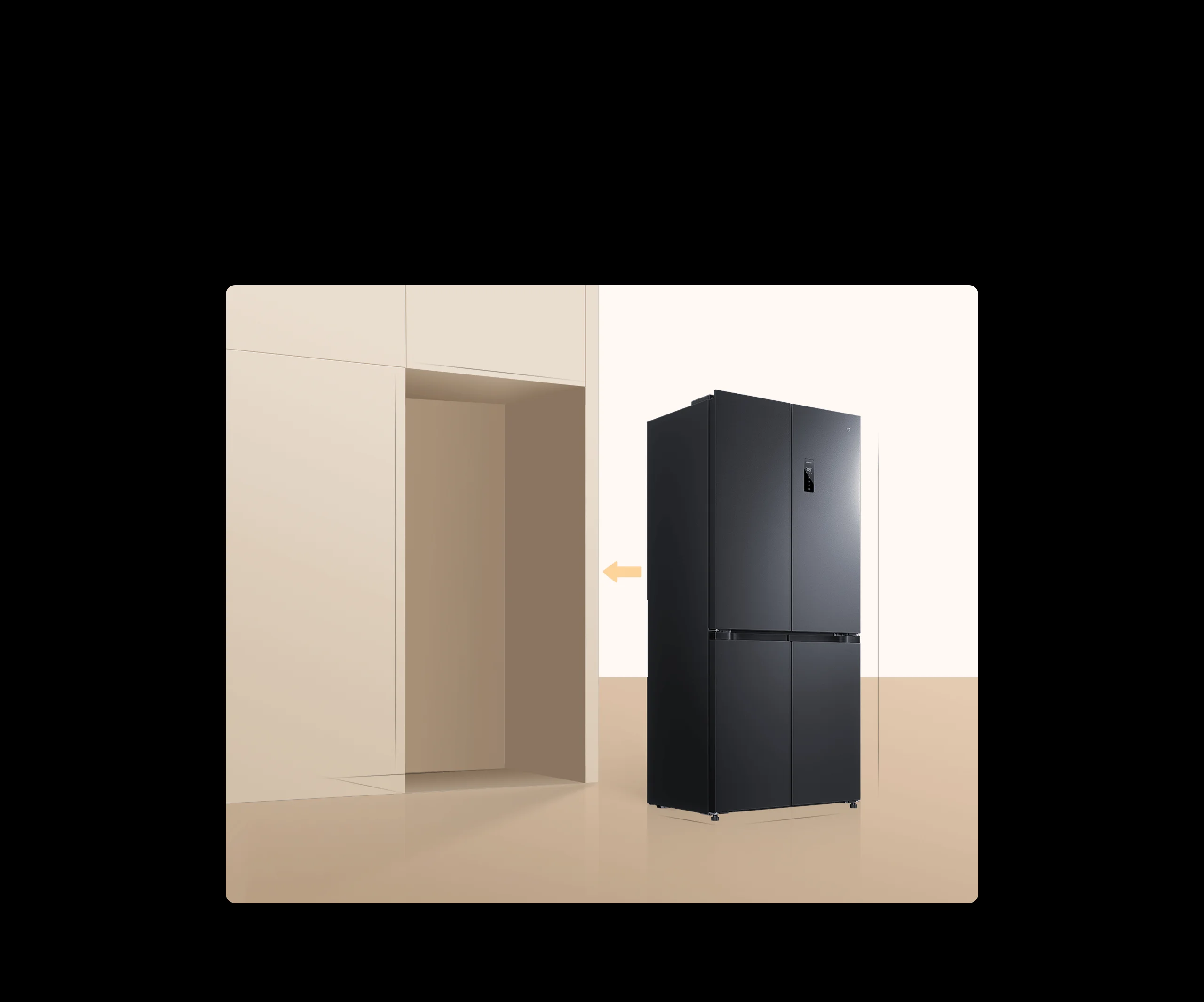 Tủ lạnh 4 cánh Xiaomi Mijia AI 510L có vẻ đẹp tinh gọn mà sang trọng. Với độ sâu chỉ 60cm, chiếc tủ lạnh dễ dàng hòa hợp trong nhiều không gian bếp mà không chiếm quá nhiều diện tích. Cửa mở 90° giúp thao tác lấy thực phẩm, kéo ngăn tủ trở nên thoải mái ngay cả khi đặt sát tường – một giải pháp tiện lợi cho những căn bếp giới hạn diện tích.